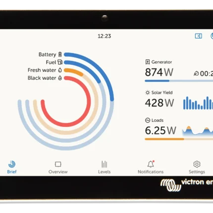 Écran tactile 5" pour Cerbo GX. Affichage temps réel : production solaire, état batterie, consommation. Compact, idéal tableau de bord van.