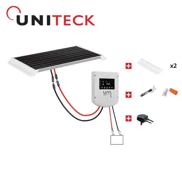 Kit solaire Uniteck 100W – 12 V – monocristallin avec régulateur MPPT, prêt à installer pour van, fourgon aménagé et camping-car. Solution complète incluant panneau, fixation, régulation, câblage et accessoires d’installation.